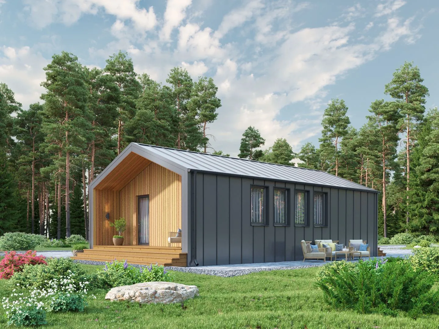 Откройте для себя идеальный дом для всей семьи — **Барнхаус‑11**. Это современный одноэтажный шедевр, сочетающий в себе уют и функциональность. Весь его облик вдохновлен классическим барнхаус‑стилем: простые линии, открытая планировка, просторные комнаты и светлое, непринуждённое настроение. Благодаря непрерывному доступу к комфортной среде, жильё удобно для круглогодичного проживания: утеплённые стены из полистиролбетона и двухскатная кровля позволяют сохранять тепло зимой и прохладу летом, создавая идеальный микроклимат даже вне зависимости от погоды. Дом оборудован просторной террасой, где можно проводить бесконечное количество семейных мероприятий на свежем воздухе, а отсутствие балконов и веранд делает интерьер ещё более открытым и непринуждённым. Несмотря на небольшие размеры, он при этом экономичен и экологичен: полистиролбетон обеспечивает отличную теплоизоляцию и снижает энергопотребление. В Барнхаус‑11 нет прикованного гаража, но это не мешает создать уют в любой квартире — всё жильё спроектировано так, чтобы оставлять достаточно пространства для личных вещей и хобби. Этот дом — идеальный выбор для тех, кто ценит простоту, функциональность и комфорт в одном объёме.