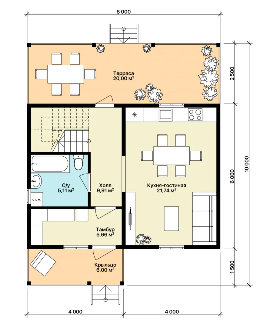 Пусть ваше воображение уже погружено в уют этого двухэтажного дома площадью 60 м², где каждая деталь говорит о комфорте и гармонии. Сдержанный классический стиль придает ему утончённую элегантность, а деревянный каркас создаёт ощущение тепла и живописной рукотворности. Просторные комнаты, из которых выходят в светлую, открытую террасу, приглашают к летним вечерям и романтичным прогулками, а надёжный двускатный покров обеспечивает защита от всех погодных условий. Дом спроектирован с мыслью о круглогодичном проживании: просторный холл, удобная планировка и высокие потолки делают его идеальным местом для жизни в любую пору года. Никаких балконов, но терраса уже позволяет расширить горизонты вашего пространства: она служит как открытым окном в сад, так и уютным уголком, где можно наслаждаться свежим воздухом и рассветами. Откройте для себя сочетание традиций и практичности в этом уютном уголке, где каждый день начинается с улыбки и спокойствия.