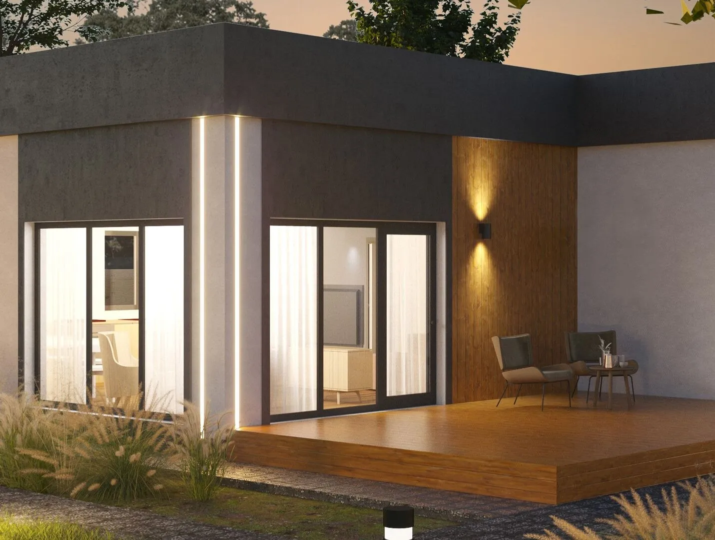 **Дом FORMEHOUSE 118 – современное решение для ваших мечт о простоте и уюте.** Одноэтажный, идеально подходящий для круглогодичного проживания, этот дом воплощает в себе минимализм в каждой детали: чистые линии, открытые пространства и лаконичная палитра материалов. Стены, выполненные из полистиролбетона, обеспечивают исключительную тепло- и звукоизоляцию, а плоская крыша не только придает зданию современный вид, но и позволяет быстро собрать небольшую солнечную панель, делая дом самодостаточным в энергообеспечении. Гостиная, оборудованная большими окнами, позволяет проникать естественному свету и открывает пространство на видны окрестности, создавая ощущение простора даже внутри закрытой планировки. Кухонный уголок легко преобразуется в домашний офис, а спальня – в тихий уголок отдыха. Функциональная площадь, без лишних балконов и галерей, подчёркивает практичность. Этот дом – идеальный вариант для тех, кто ценит чистый дизайн, экономию и комфорт без компромиссов.