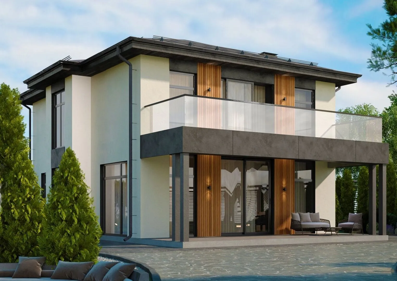 **Каммертон** – это воплощение истинной классической элегантности в современном двухэтажном доме, созданном для тех, кто ценит комфорт круглый год. Хозяйственная планировка с минималистичным дизайном, объединённая изысканными традициями, позволяет наслаждаться просторными комнатами и световыми потоками. Внутри встречается гармония формы и функциональности: от открыто заграничных дверей до гармонично расставленных окон, обеспечивающих достаточное естественное освещение. Текстурированные газобетонные фасады передают ощущение тепла и прочности, а чётверскатная вальмовая крыша добавляет монументальности и защищает от непогоды. Утренний свет ласкает балконы, превращенные в террасы, где уютно разложить палки ароматного кофе над видом живописного сада. Здесь каждый угол говорит о заботе о комфорте: от надежно встроенных систем отопления до теплоизолированной конструкции, чтобы ваше лето было теплым, а зима – душевно приятной. Выбирая **Каммертон**, вы выбираете стильный, уютный и надежный дом, где каждая деталь, от простых дверных рам до изысканных оконных проемов, продумана до мелочей. Приглашаем вас открыть для себя новый уровень жизни – место, где гармония архитектуры и современного комфорта встречаются, создавая пространство, которое будет не просто вашим домом, а вашим личным убежищем.