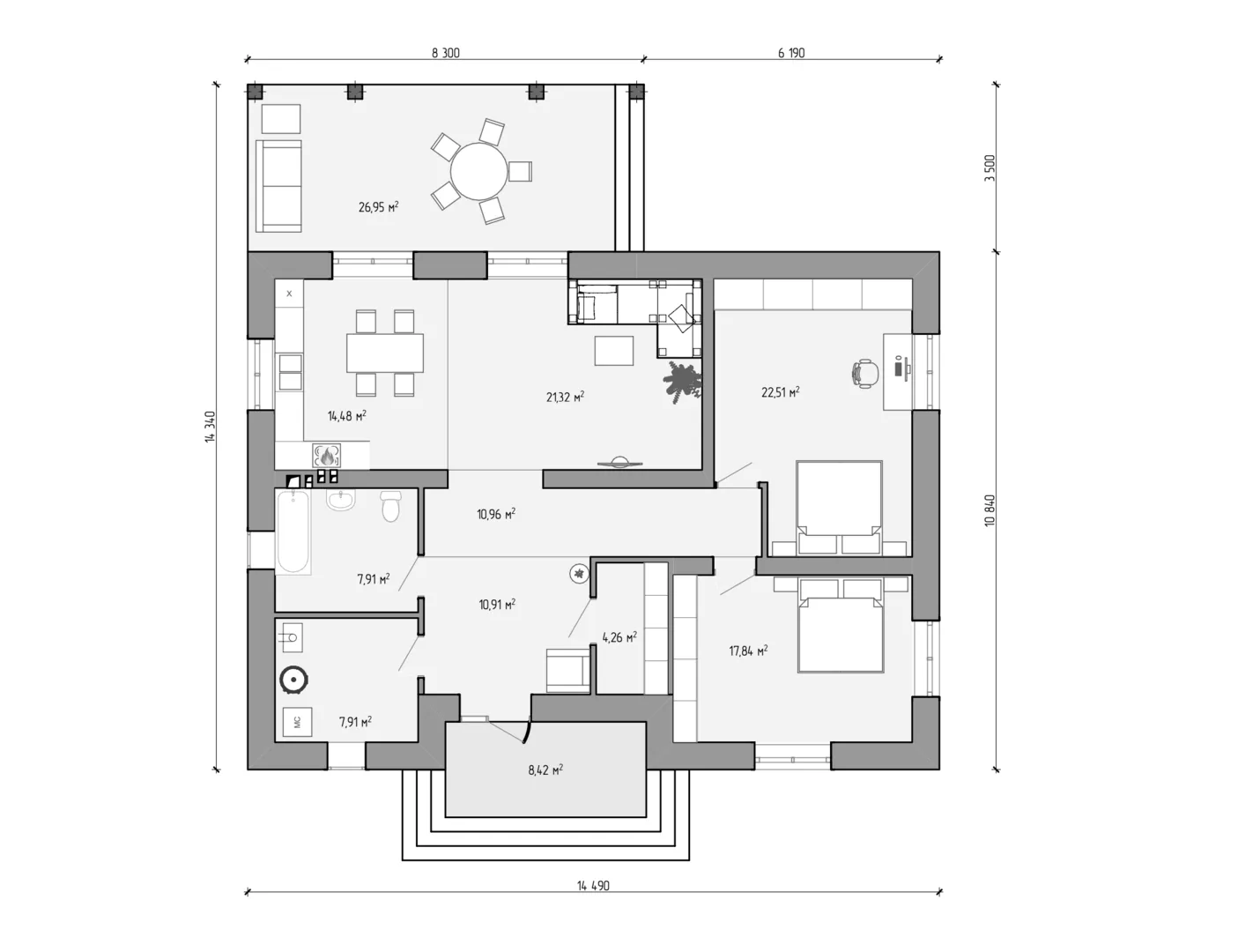 Вас ждет уютный шедевр минимализма, где каждая деталь продумана до совершенства. Этот одноэтажный дом с кирпичным обликом сочетает в себе простоту и современные технологии, создавая атмосферу безмятежности и комфорта круглый год. Просторные светлые комнаты открываются на живописные просторы, позволяя впустить наружный свет и ощущение простора, даже внутри. Гостиная, оформленная в спокойных тонах и акцентирующих чистые линии, обеспечивает гармоничное пространство для отдыха и развлечений. Внутреннее убранство отличается функциональностью и вниманием к деталям, а просторная веранда приглашает проводить вечера на свежем воздухе, наслаждаясь прохладой. Четырехскатная (вальмовая) крыша не только придает дому элегантный силуэт, но и обеспечивает надёжную защиту от непогоды. Этот дом – идеальное воплощение комфортной жизни, где нет ненужных деталей, а каждый элемент служит своему назначению. Если вы ищете стильный, светлый и функциональный уголок, где можно отдохнуть от городской суеты, KDR‑203 станет вашим идеальным выбором.