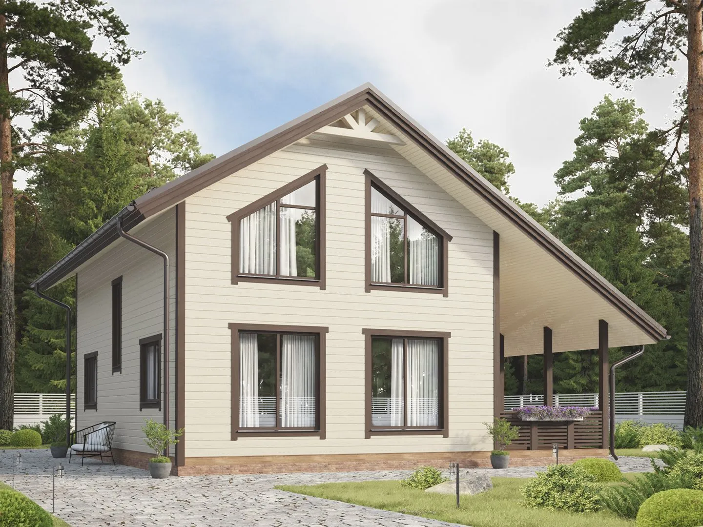 Дом «Максимачева» — это воплощение классики в гармонии с природой. Походя по просторным подъёмным коридорам, вы сразу почувствуете уют и тёплую атмосферу, характерные для деревянных конструкций. Двухэтажный фасад с традиционной двускатной крышей придаёт дому аутентичный, при этом надёжный и теплый вид, способный выдержать любые климатические условия. Этажи пропитаны светом, а на втором уровне открывается живописный вид на прилегающую территорию, благодаря просторной террасы, где можно проводить время в кругу семьи, наслаждаясь свежим воздухом и звуком природы. Подвал с чердачным пространством становится дополнительной комнатой для хранения, творчества или уютного рабочего уголка. Отсутствие балконов, веранд и прицепного гаража подчёркивает чистоту и простоту внешнего облика, а при этом все зоны дома рассчитаны на комфортный круглетажный проживание, обеспечивая полный комфорт даже в самые холодные и жаркие периоды года. Такой дом приглашает к спокойной жизни, где каждый момент становится событием.