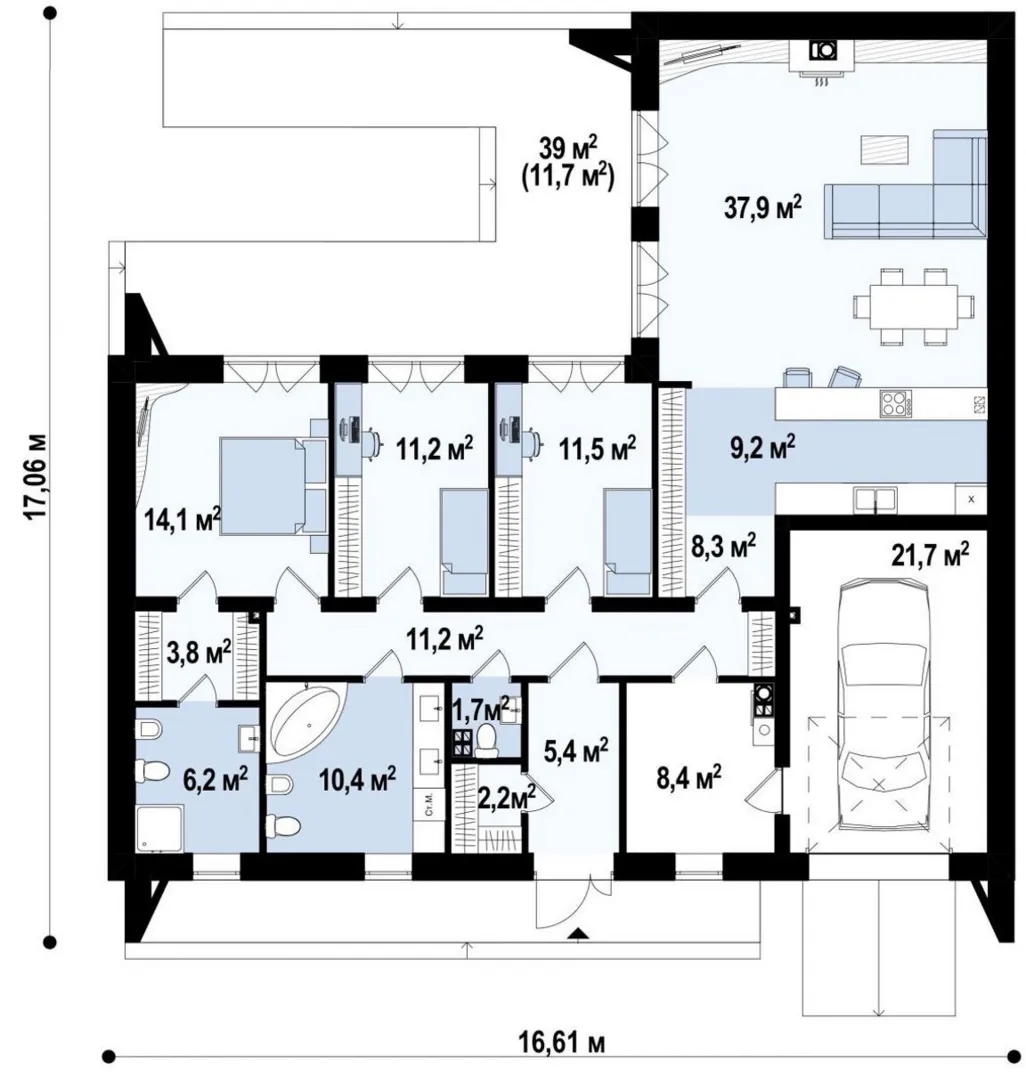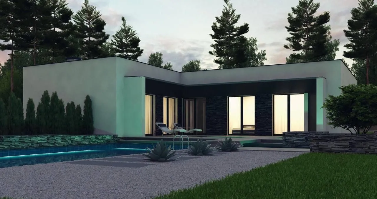 Заказать конусльтацию по:Одноэтажный дом Авангард 1.163