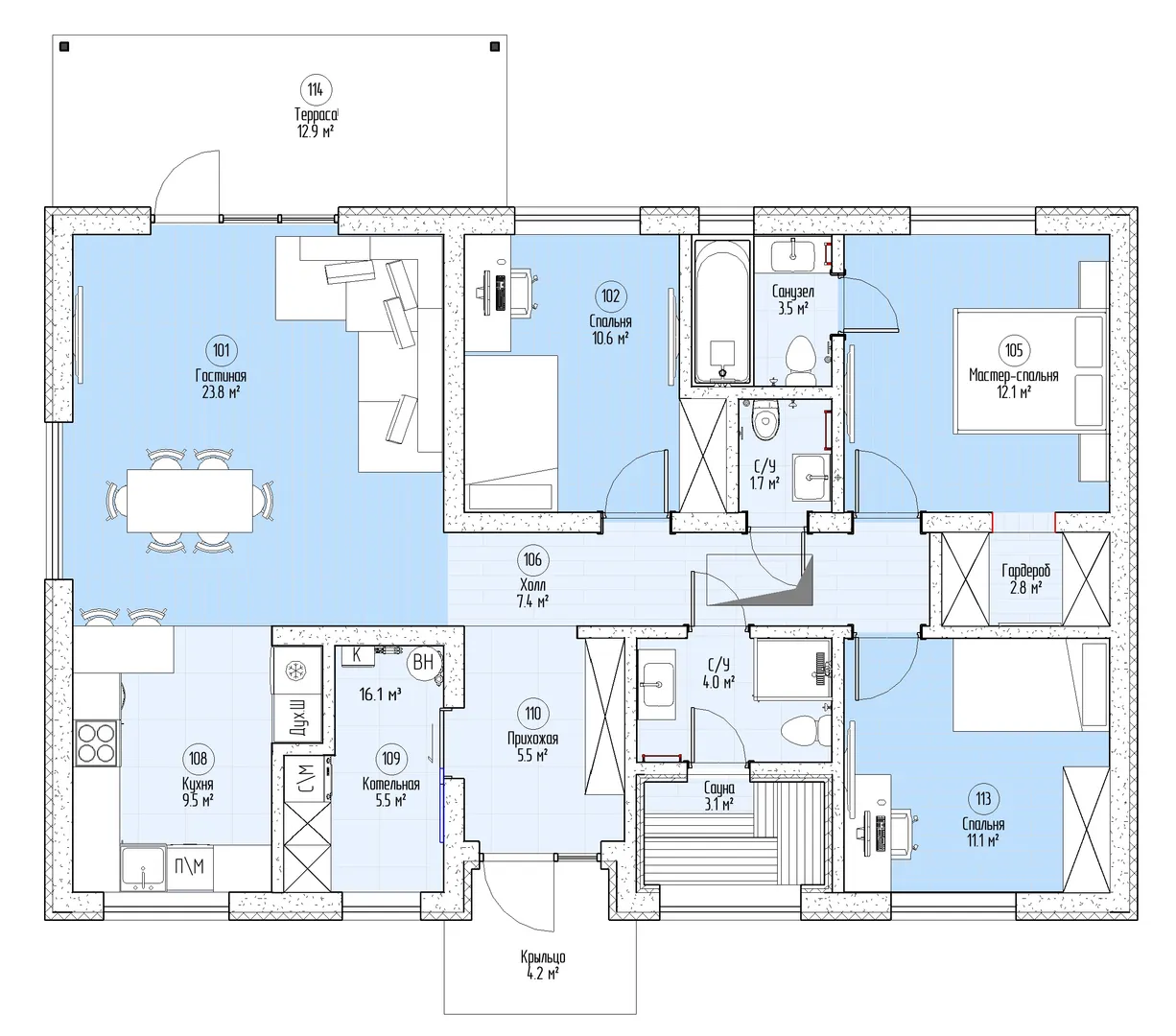 Одноэтажный дом по проекту Латен Макс - 114 м2