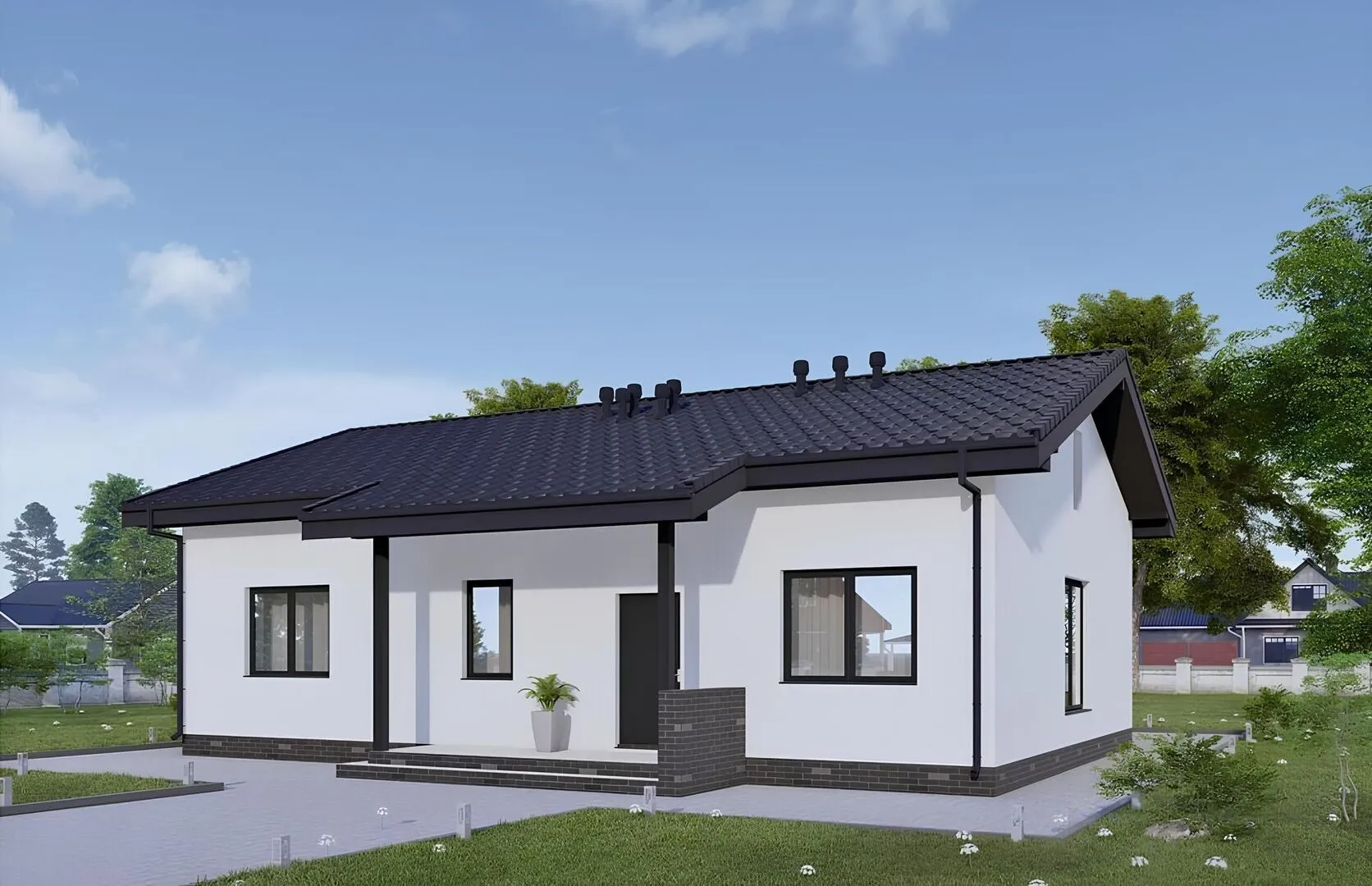 Одноэтажный дом с двумя крыльцами и 3 спальнями р181