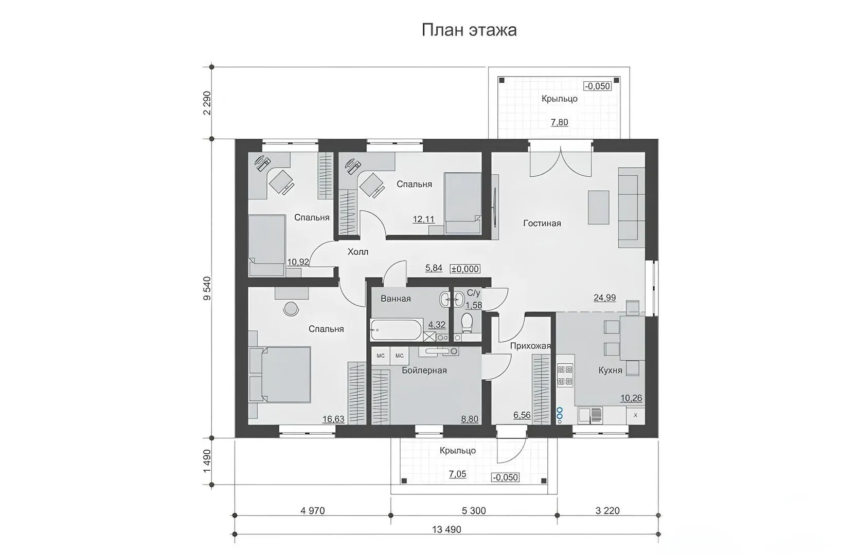 Заказать конусльтацию по:Одноэтажный дом с двумя крыльцами и 3 спальнями р181