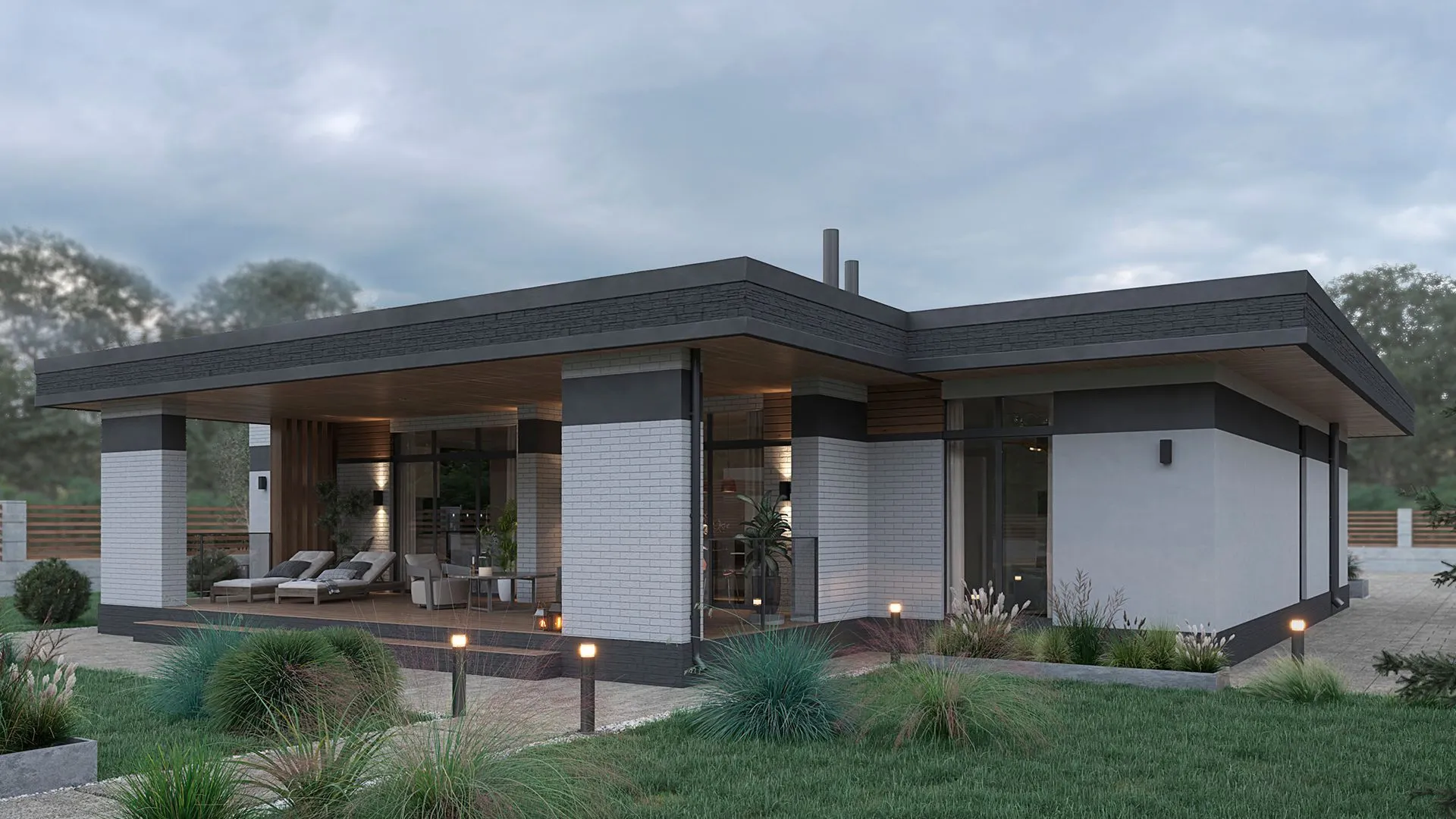 Одноэтажный дом с верандой в стиле минимализм