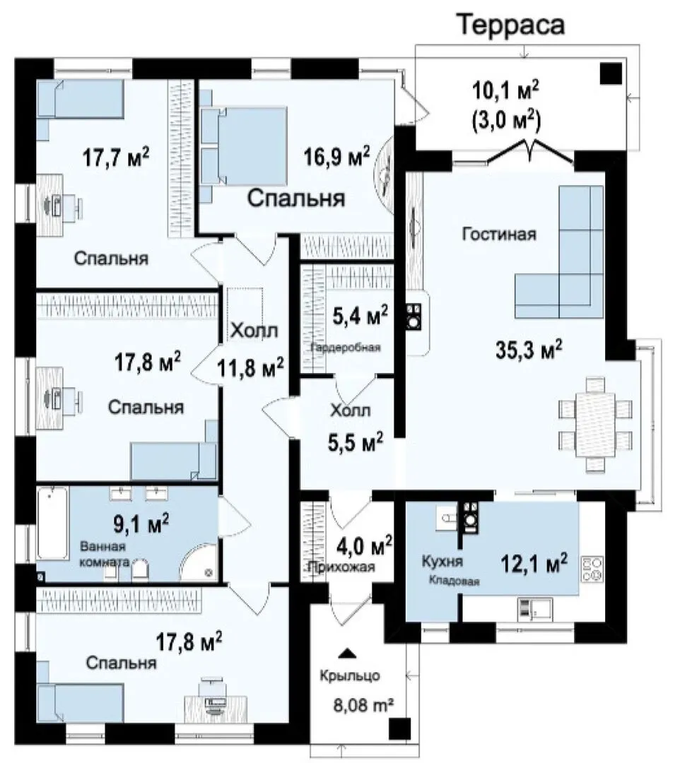 Одноэтажный коттедж с четырьмя спальнями S3-153-3 (Z200 BG)