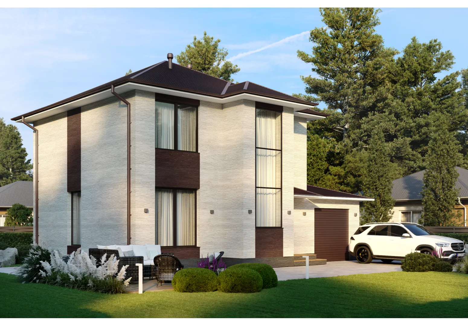 **Пусть ваш дом станет настоящим уголком благополучия.** Проект «А009» в классическом исполнении сочетает в себе традиционную красоту и современные удобства. Двухэтажное строение, рассчитанное на круглогодичную жизнь, гарантирует комфорт в любое время года: утепленная крыша, герметичные керамические блоки наружных стен и просторные комнаты делают ваш дом тепло­устойчивым и защищённым от ветра и дождя. Просторные окна и светлые интерьеры создают атмосферу уюта и гармонии, а отсутствие балконов и веранд позволяет полностью сосредоточиться на внутреннем пространстве, не отвлекаясь на внешние конструкции. **Идеальное сочетание практичности и функциональности.** Квартиры проекта предлагают уютный подвесной чердак для хранения вещей, что особенно ценно в современных условиях ограниченного пространства. Пристроенный гараж/крытая автостоянка избавляет от забот о безопасном хранении автомобиля, а четырёхскатная (валмовая) крыша обеспечивает надёжную защиту от осадков и позволяет легко управлять влагой. Это идеальный выбор для семей, ценящих качество строительства, а также для тех, кто стремится к спокойствию и уюту в собственном доме.
