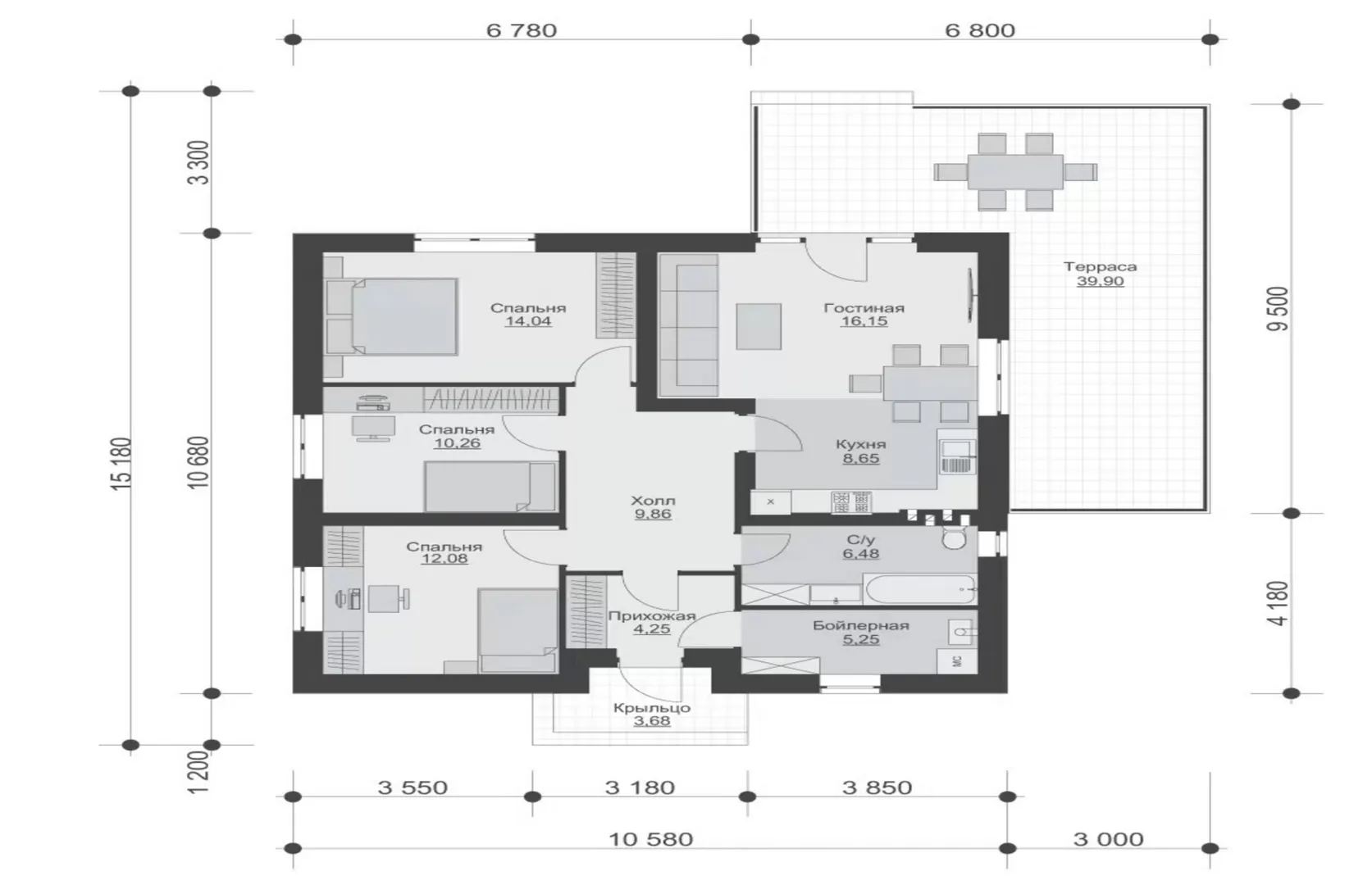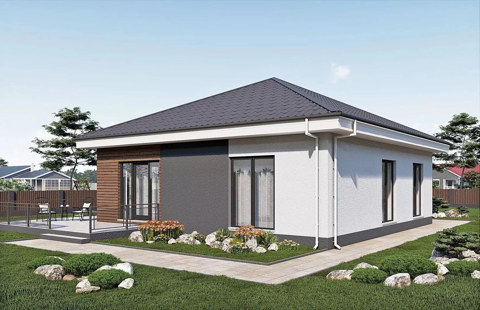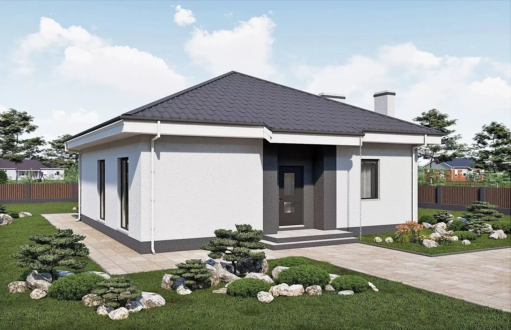 В сердце спокойного городского окружения вы найдёте уютный уголок, который с первого взгляда поражает своей простотой и одновременно элегантностью. Дом RG6105 воплощает в себе европейский шарм: строгие линии фасада, лаконичные, но в то же время выразительные детали, а просторные окна задают ощущение лёгкости и открытости. Стены, построенные из газобетонных блоков, не только дарят тепло и шумо‑изоляцию, но и придают зданию прочность, надёжность и высокие эксплуатационные характеристики. Одноэтажная конструкция делает этот дом идеальным для круглогодичного проживания: свободное пространство, без лишних лестниц, удобно для всех возрастов, а чердачное помещение открывает новые возможности – от уютного домашнего офисного уголка до дополнительного жилого пространства. Трёхскатная крыша подчёркивает европейский стиль, а на уютной террасе можно наслаждаться чашкой кофе утреннего света или организовывать вечерние сборы с друзьями. Без привязанных гаражных помещений это делает пространство более гибким – можно свободно планировать автостоянку на открытом воздухе или использовать внутренние помещения под дополнительные зоны отдыха. Дом RG6105 – это не просто жильё, а настоящий оазис комфорта: стильный экстерьер, продуманные внутренние решения и возможность создать свое собственное уютное пространство здесь, где каждая деталь задумывалась для удобства и гармонии с окружающим миром.