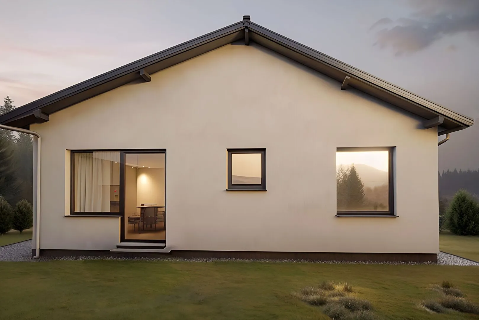 Вас ждет уютный загородный уголок, где каждая деталь продумана до мелочей. Дом одного надземного этажа выполнен в стиле европейского шика – элегантные линии, гармоничный пропорциональный облик и лёгкая, но прочная керамзитобетонная кладка создают теплую атмосферу, идеально подходящую для круглогодичного проживания. При проектировании уделено внимание функциональности: от классического деревянного пола до современных отделок, которые придают помещению светлую и воздушную обстановку. Готовый к жизни дом с двускатной крышей дарит вам простоту и уют без лишних архитектурных акцентов. В отсутствие балконов и веранды уют складывается в уютных стенах: здесь вы можете спокойно собраться всей семьей, а в открытой зоне во дворе можно устроить пикник, окружённый зеленью. В данном проекте нет прицепленных гаражей и чердачного пространства, но керамзитобетонные стены сохраняют тепло в любой сезон, а простая, но элегантная крыша создаёт идеальны условия для отдыха и восстановления сил. Этот дом – идеальный выбор для тех, кто ищет простоту, комфорт и неповторимый загородный шарм. С его помощью вы обретёте настоящий дом на природе, где каждая минутка наполнена гармонией и безмятежностью.