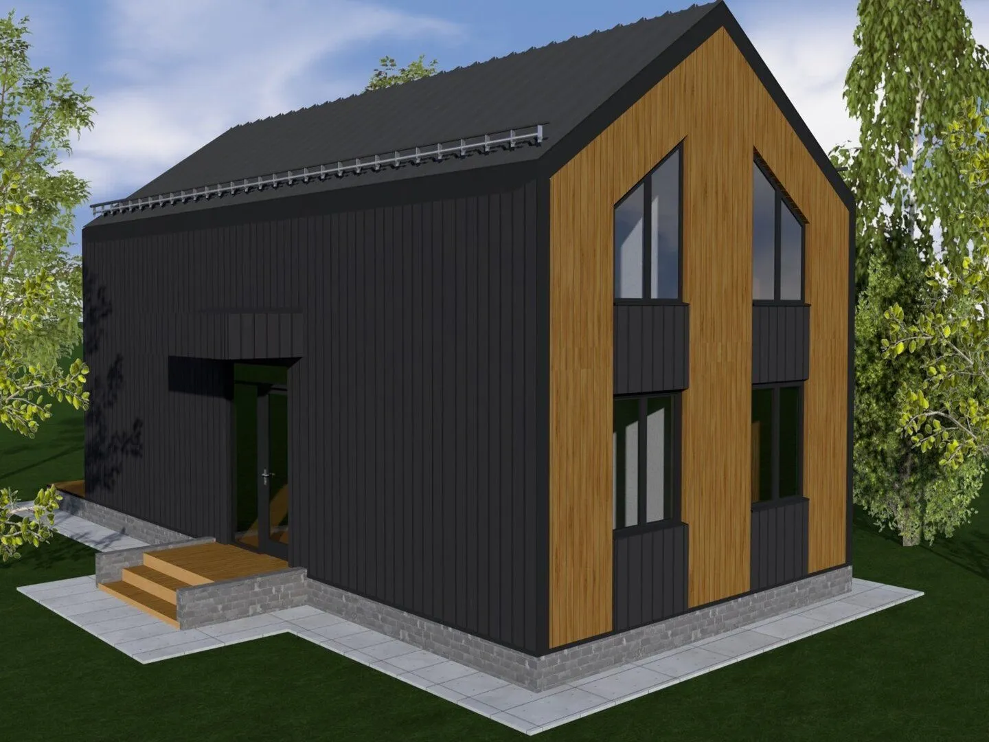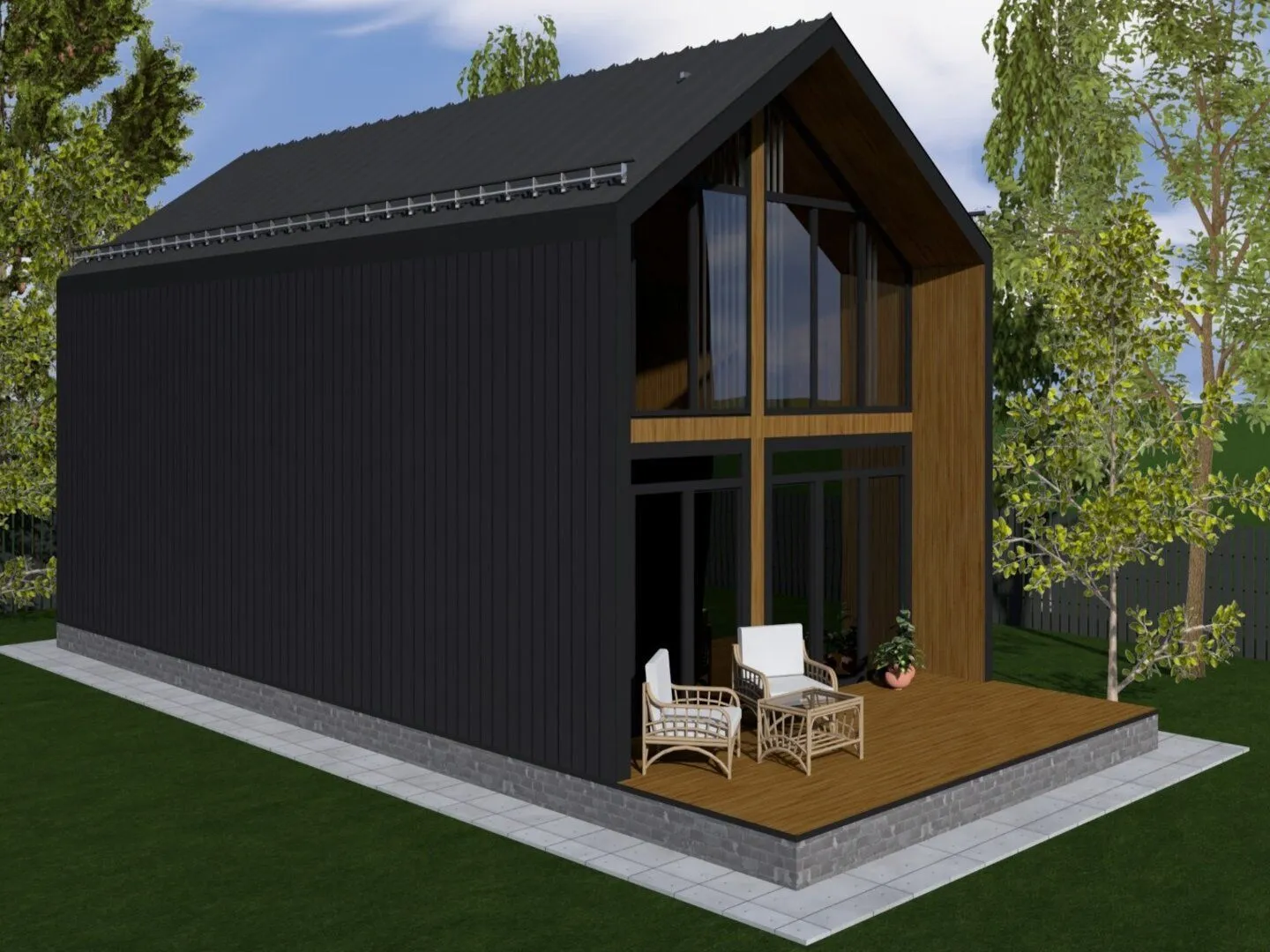**Barnhouse‑1** – это воплощение современного английского фермского стиля, присущий уюту и простоте. Дом располагается на двух надземных этажах, а благодаря использованию SIP‑панелей наружных стен он обеспечивает высокую тепло- и звукоизоляцию, позволяя наслаждаться комфортом круглый год. Двускатная крыша создаёт ощущение открытого пространства и плавно вписывается в профиль традиционного барнхауса, придавая зданию гармоничное и элегантное очертание. Светлые и просторные внутренние помещения раскрываются при помощи больших панорамных окон, а элегантный пол из плитки в нотации «свинка» соединяет все зоны. Внутри удобно расположены открытая кухня‑столовая, светло оформленные спальни и современные санузлы. Страницы обстановки легко перелистываются от светлой гостиной к уютной библиотеке, благодаря чему каждая зона обретает собственное «свое» настроение, а тем временем терраса приглашает к отдыху под открытым небом, создавая идеальное пространство для романтических вечеров и семейных вечеринок. Эта уникальная интерпретация барнхауса сочетает в себе традиционные элементы со свежей практичностью – отсутствие балконов и веранд не влияет на уровень комфорта, ведь каждый уголок наполнен естественным светом и продуманным акустическим решением. При желании, к дому можно добавить внешний гараж, но даже без него он уже кажется полноценным семейным убежищем. Barnhouse‑1 – ваше новое убежище, где современность обнимает прошлое, а уют превращается в образ жизни.
