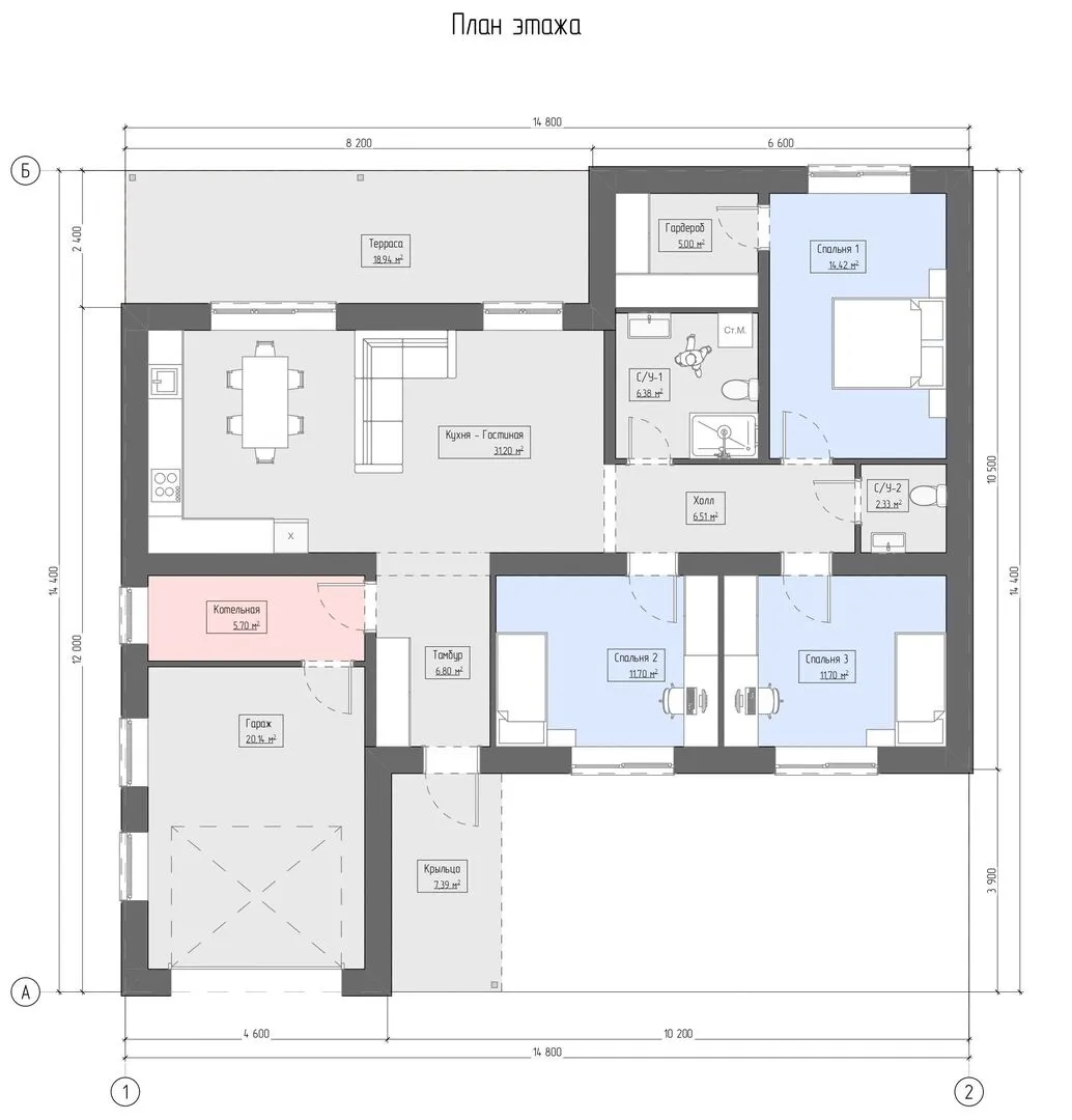 Стиль, уют и надёжность — вот что ждёт вас в «Байрак 1‑141». Это очаровательное одноэтажное жилище, построенное в традиционном русском архитектурном стиле, создано для комфортного круглогодичного проживания. Внешние стены из керамзитобетонных блоков обеспечивают отличную тепло- и звукоизоляцию, а четырёхскатная вальмовая крыша придаёт дому элегантный внешний вид и гарантирует безопасное укрытие от непогоды. Без излишних лишних деталей, «Байрак 1‑141» отличается простотой и практичностью: в доме нет балконов, лоджий или веранды, но вы всё равно получаете просторную террасу, где можно наслаждаться рассветом или проводить барбекю с друзьями. Пристроенный гараж или крытая автостоянка удобно защелкивает ваш автомобиль, избавляя от лишних хлопот. Внутреннее пространство тщательно продумано, чтобы каждый уголок был максимально комфортным: от уютного прихожего до светлого, функционального дома. Если вы ищете идеальное сочетание стиля, практичности и уюта, «Байрак 1‑141» станет отличным выбором. Он спроектирован так, чтобы вы чувствовали тепло и безопасность в любое время года, а прибрежный дизайн делает жильё настоящим оазисом спокойствия в динамичном мире. Откройте для себя новый уровень комфорта в этом великолепном доме, где каждый день начинается с улыбки.