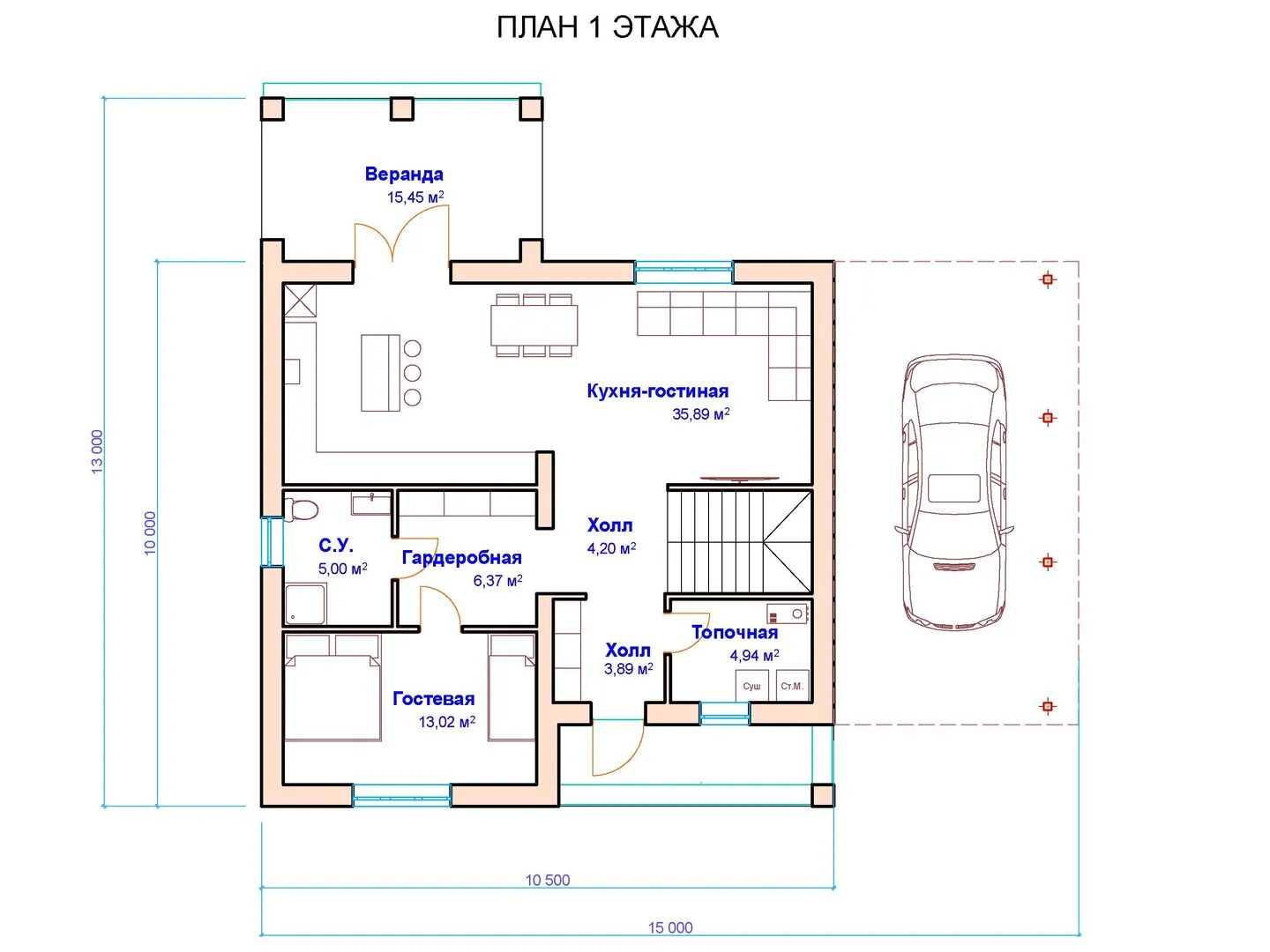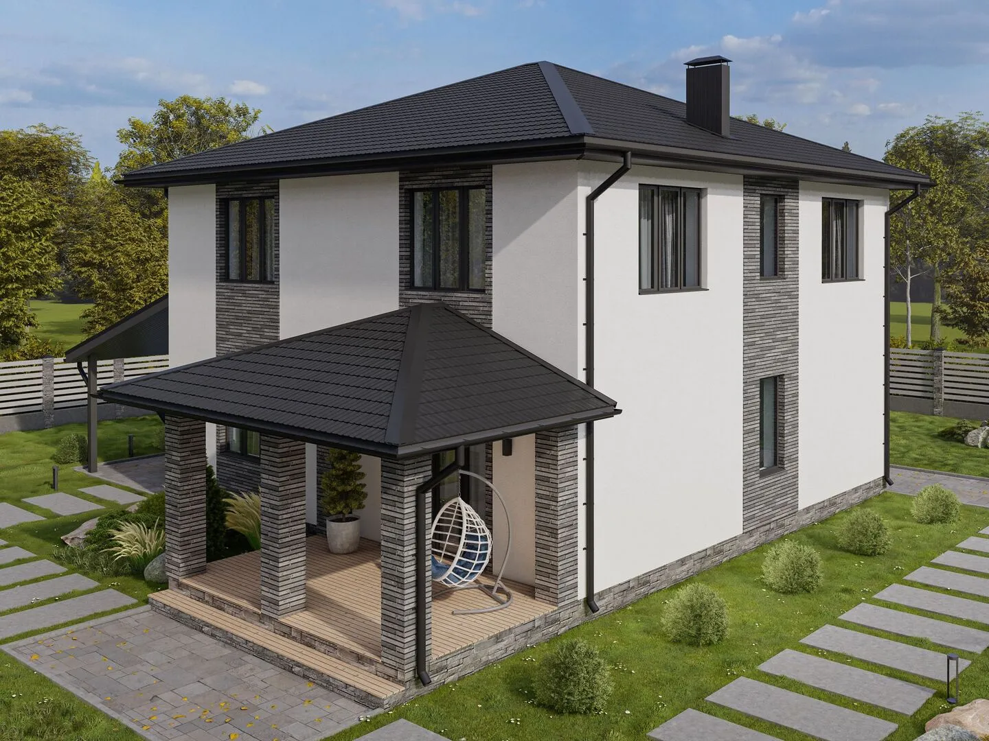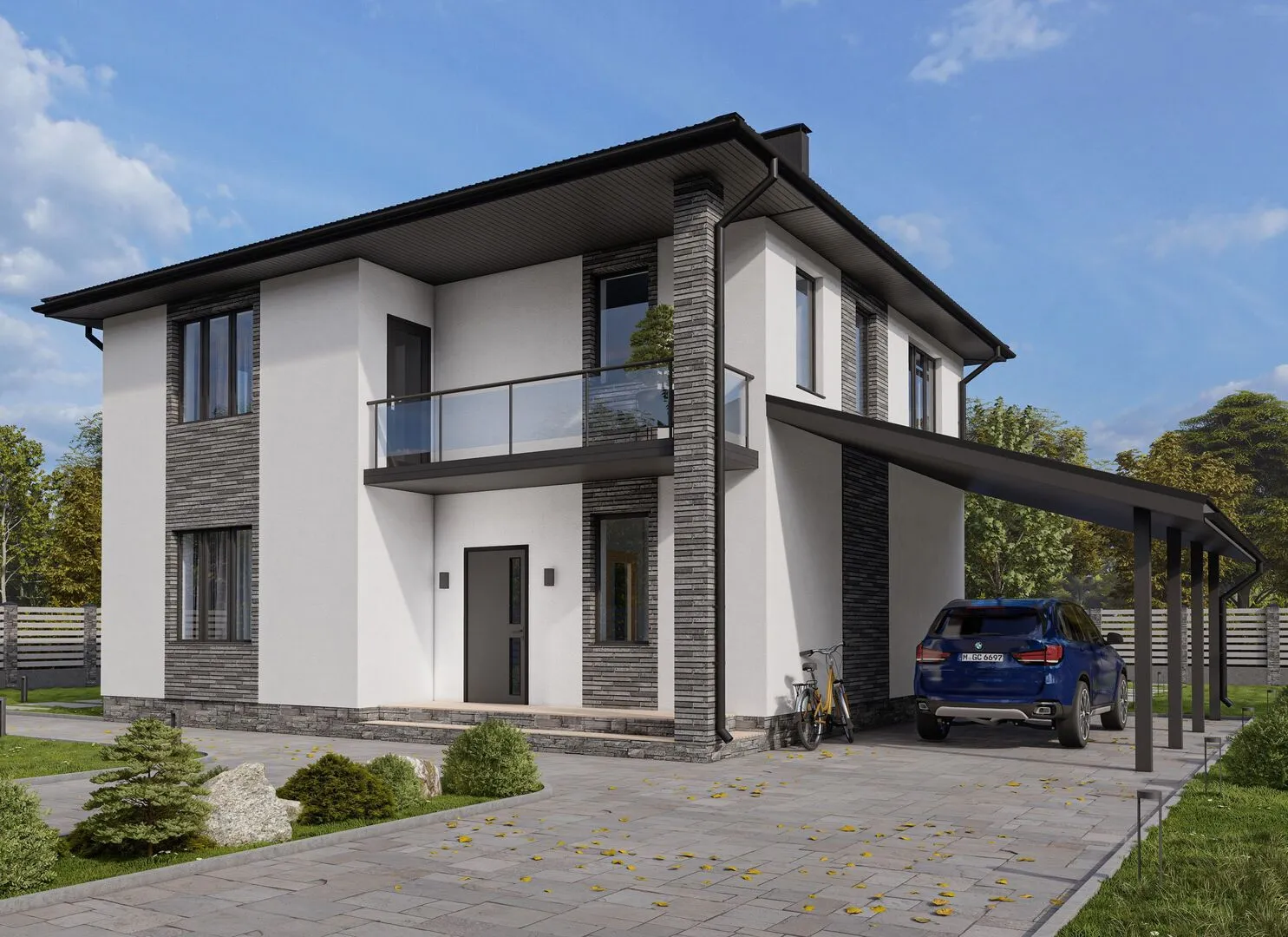 Двухэтажный дом с навесом для автомобиля Б019