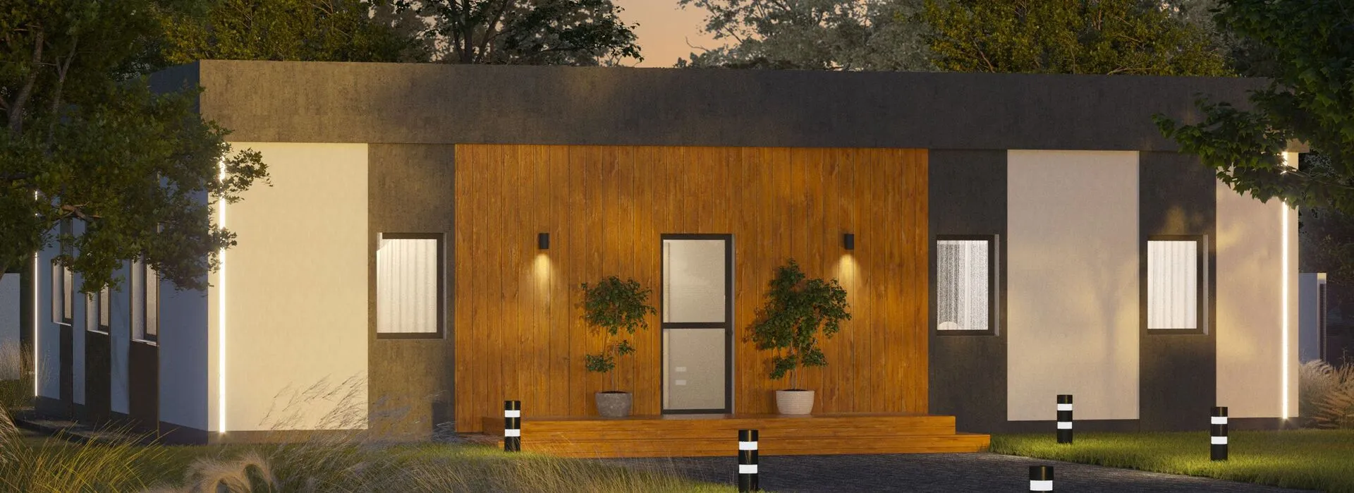 **Дом FORMEHOUSE 118 – современное решение для ваших мечт о простоте и уюте.** Одноэтажный, идеально подходящий для круглогодичного проживания, этот дом воплощает в себе минимализм в каждой детали: чистые линии, открытые пространства и лаконичная палитра материалов. Стены, выполненные из полистиролбетона, обеспечивают исключительную тепло- и звукоизоляцию, а плоская крыша не только придает зданию современный вид, но и позволяет быстро собрать небольшую солнечную панель, делая дом самодостаточным в энергообеспечении. Гостиная, оборудованная большими окнами, позволяет проникать естественному свету и открывает пространство на видны окрестности, создавая ощущение простора даже внутри закрытой планировки. Кухонный уголок легко преобразуется в домашний офис, а спальня – в тихий уголок отдыха. Функциональная площадь, без лишних балконов и галерей, подчёркивает практичность. Этот дом – идеальный вариант для тех, кто ценит чистый дизайн, экономию и комфорт без компромиссов.