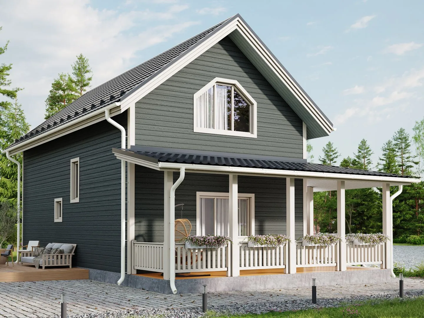 Добро пожаловать в каркасный дом Тало‑159 – ваш новый уютный уголок, где современность и природа живут бок о бок. Построенный из прочного деревянного каркаса, он рассчитан на круглогодичное проживание и сохраняет тепло в холодные зимы, а прохладную прохладу в летний период. Двухуровневый интерьер открывает просторные комнаты, которые легко адаптировать под ваши потребности. Стиль скандинавского дизайна подчёркнут светлыми тонами, лаконичной планировкой и открытыми пространствами, создающим ощущение простора и свободы. Внешняя облицовка из натурального дерева придаёт фасаду теплый, но элегантный вид, а комбинированная кровля обеспечивает надёжную защиту от непогоды и добавляет архитектурный акцент. Терраса на заднем дворе приглашает к прогулкам и уютным вечерним посиделкам на свежем воздухе, а отсутствие лишних конструкций, как веранда, пристроенный гараж или чердак, делает ваш дом свободным и просторным. В Тало‑159 вы найдёте идеальное сочетание современного комфорта и естественной гармонии, которое будет радовать вас в любой сезон.