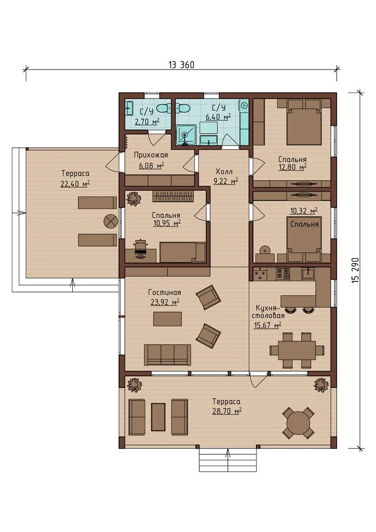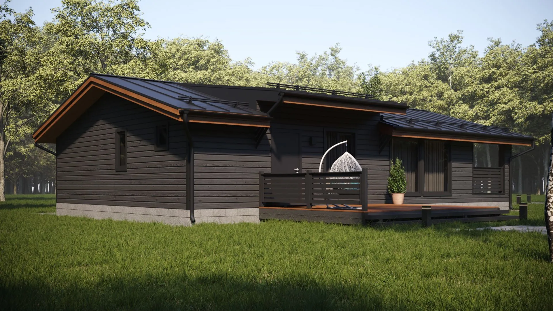 Прекрасный шале‑дом Mercury‑1 воплощает в себе идеальное сочетание традиционного очарования и современного комфорта. На одном уровне находится уютное жилище, которое способно обогреть в любой сезон благодаря тщательно продуманной теплоизоляции и теплом, исходящим от деревянных каркасных стен. Стиль шале придаёт дому неповторимую атмосферу, будто вы оказались в горах, но при этом вы живёте в самом сердце города. Величественная двускатная крыша создаёт благоприятный микроклимат внутри, а просторная веранда и терраса приглашают проводить время на свежем воздухе – будь то ранние утренние прогулки или вечера у камина с чашкой горячего чая. Дом рассчитан на круглогодичное проживание: неважно, какой у нас сезон, здесь всегда тепло и светло. Оставив лишние элементы вроде гаража и лестничного каркаса, дизайнеры нашли баланс простора и функциональности, создавая идеальное пространство для отдыха, работы и семейных встреч. Mercury‑1 – это ваш личный уголок уюта и вдохновения.