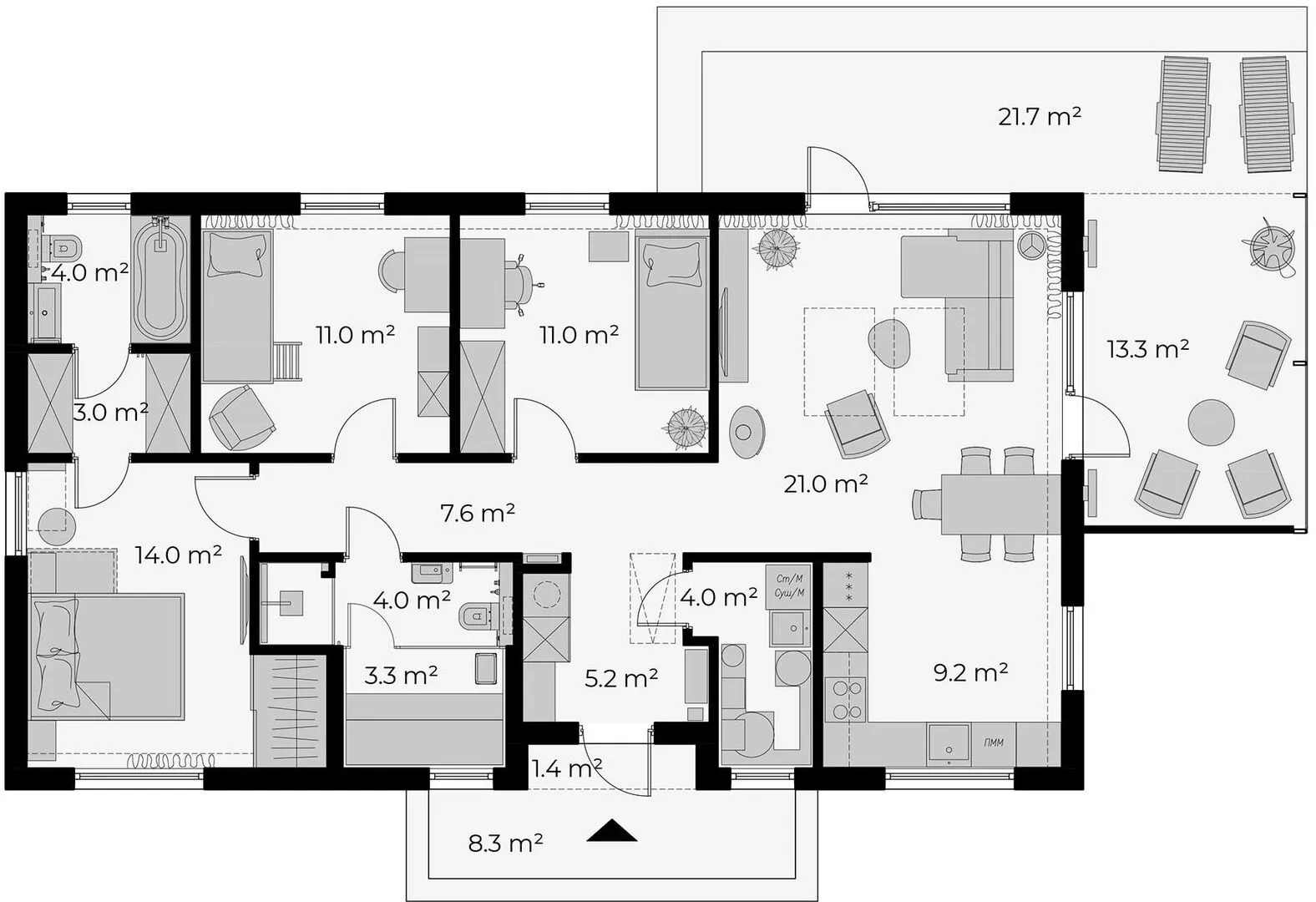 Погрузитесь в атмосферу уюта и благородства с домом «Микея 3» – истинным воплощением европейского стиля на благо вашего семейного счастья. Это одноэтажное жильё, рассчитанное на круглогодичную жизнь, сочетает в себе простоту безмятежного дизайна и насыщенную функциональность. При входе вас встретит светло‑теплый гостеприимный зал, а благодаря просторному пространству и дополнительному лобби‑свету, каждый день становится ярче и приятнее. Веранда, обрамленная легкими деревянными колоннами, приглашает делиться моментами радости на свежем воздухе, а закрытая крытая терраса позволяет проводить приятные вечера, даже в холодную пору года. Стены, выполненные из газобетонных блоков, гарантируют высокий уровень тепло- и шумоизоляции, сохраняя дом в тепле в самые холодные дни и защищая от шума загородной местности. Плоская двускатная крыша, обрамленная массивными чердачными окнами, добавляет ощущение простора, а внутренний чердацкий отсек открывает возможность превратить его в уютный кабинет, игровую комнату или домашний кинотеатр. При отсутствии прицепов и гаража вы получаете свободу выбора пространства под личные нужды — разместить в гаражном помещении свой велосипед, рыбалные снастки, или создать домашний спортзал. «Микея 3» – это место, где каждая деталь продумана для вашего комфорта и стиля жизни.