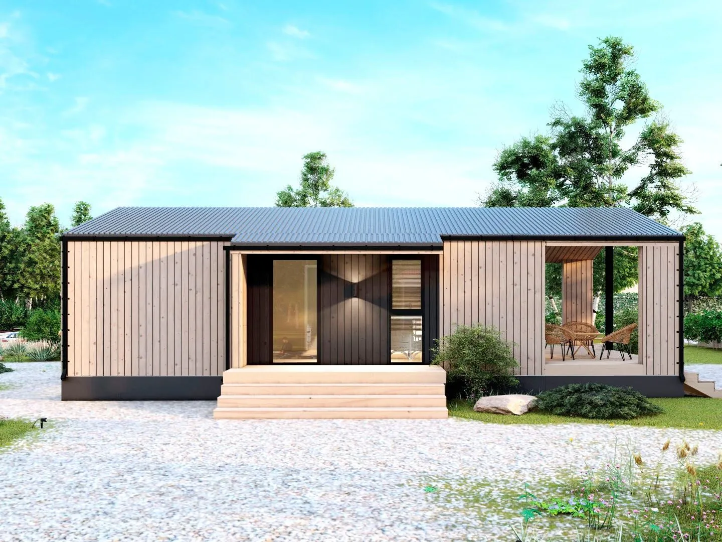 Новый модульный «Barn 75» – это воплощение уюта и современной элегантности, созданное специально для тех, кто ценит простоту, но не готов идти на компромиссы с комфортом. Однонадземный, габариты которого идеально подходят для семьи любого размера, предлагает круглогодичный комфорт: тепло, свет и тихие вечера даже в самый холодный период. В его архитектурном стиле – это истинный Барнхаус, придающий дому неповторимый скандинавский шарм: крепкая деревянная каркасно‑панельная оболочка и двускатная крыша с кромкой, напоминающей старинные амурские беседки. «Barn 75» открывает вам мир простых и изысканных деталей. Отсутствие внешних балконов и веранд не мешает вам наслаждаться солнцем: просторная терраса – ваш собственный уголок на свежем воздухе, где можно разложить шторы, устроить барбекю или просто поплавать в тени. Каждый уголок дома, от уютных полутемных площадей до светлых, открытых светильников, тщательно продуман, чтобы создавалась атмосфера домашнего тепла. Никаких лишних гаражных помещений, веранд или чердачных погребов – всё, что вам нужно, уже здесь: современный дизайн, функциональное планирование и материалы высшего качества, которые гарантируют долговечность и простоту обслуживания. Именно «Barn 75» приглашает вас открыть новую главу в жизни, где каждое утро начинается с приятного запаха свежеиспеченного хлеба, а каждая ночь – с безмятежного спокойствия. Выбирая этот модульный дом, вы выбираете не просто жильё, а место, где заботу о деталях и душевный комфорт сходятся в одном целостном ансамбле. Позвольте себе наслаждаться лучшими моментами, в окружении стиля, уюта и чистой, незапятнанной природы у вашего собственного дома.