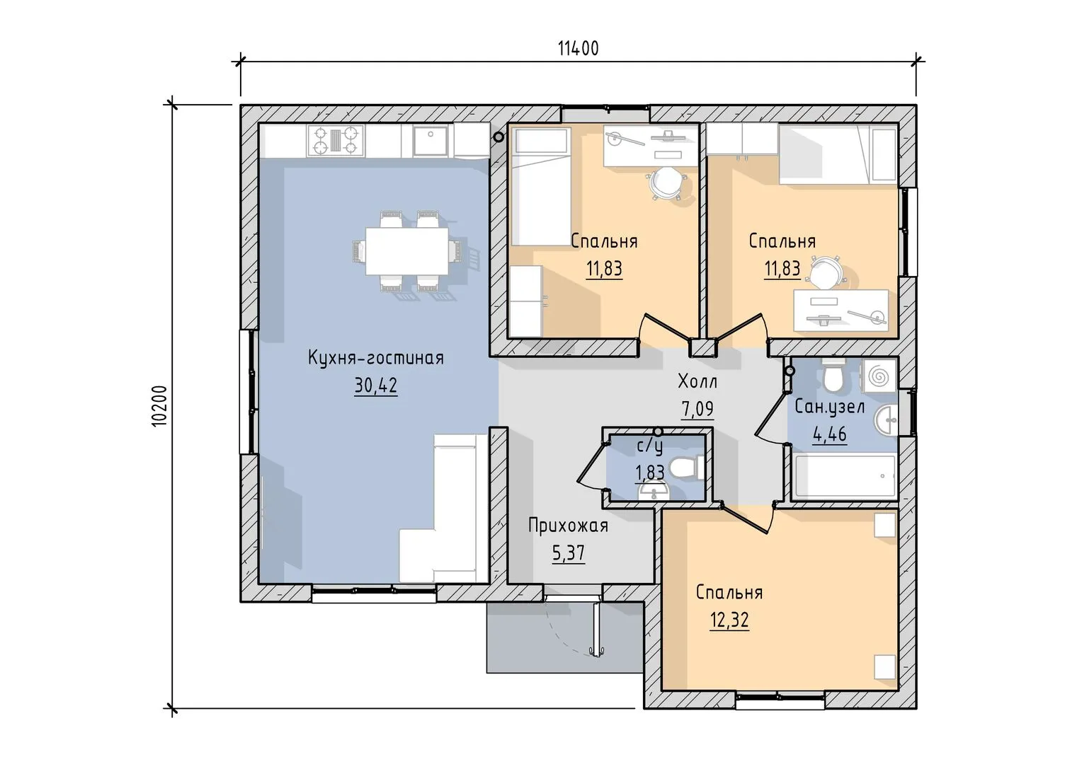 Кристально чистый одиннадцатый дом серии SR‑104 – это идеальный образец спокойной, уютной русской архитектуры, созданный для того, чтобы радовать вас каждый день, не зависимо от времени года. Внутри вы ощутите простоту и одновременно элегантность: ровные перегородки, открытые пространства и большие окна, наполняющие зал мягким естественным светом. Удобное расположение всех коммуникаций, а также материал газобетонных блоков обеспечивает изоляцию, тишину и экономичность. Внешний вид дома отражает гармонию традиций и современных тенденций. Классически‑чекки ската в стиле вальмовой крыши придают фасаду благородный вид, а строгие линии газобетонных стен создают ощущение надёжной защиты от непогоды. Несмотря на отсутствие балконов и веранды, в этой архитектурной концепции важно то, как гармонично собраны материалы и как они отвечают запросам современной семьи. Это пространство, где каждая деталь проработана, чтобы сделать проживание комфортным и вдохновляющим. Дом SR‑104 – это не просто сооружение, а целый образ жизни. Плюсы: одноэтажность гарантирует лёгкость передвижения, круглогодичное проживание позволяет наслаждаться теплом даже в самые прохладные дни, а просторный полёт над крышей открывает возможность для будущих доработок или интеграции новых технологий. Такой проект станет вашим персональным убежищем, где слияние традиций и функциональности создаёт идеальный баланс для создания уютной и счастливой семейной жизни.