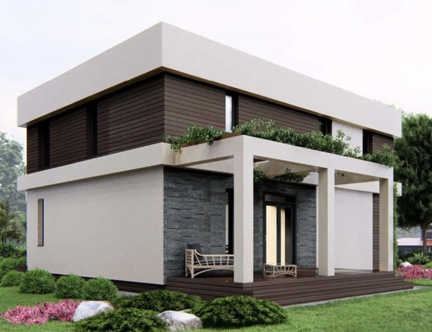 Проект загородного дома с плоской кровлей в стиле хайтек S-228